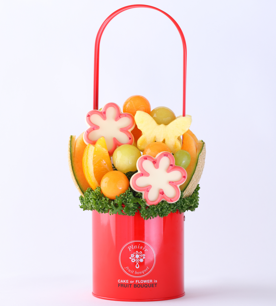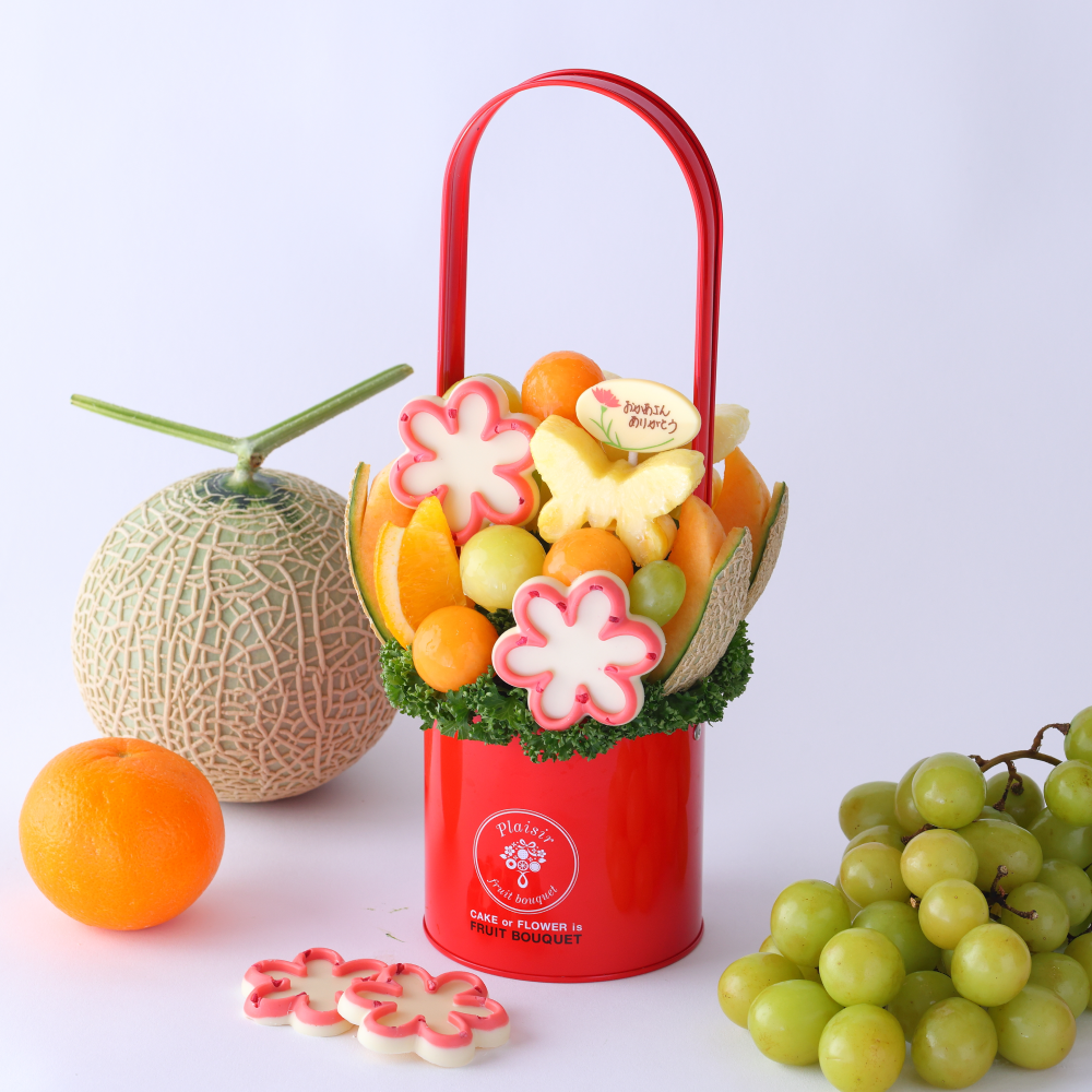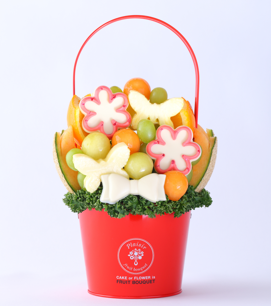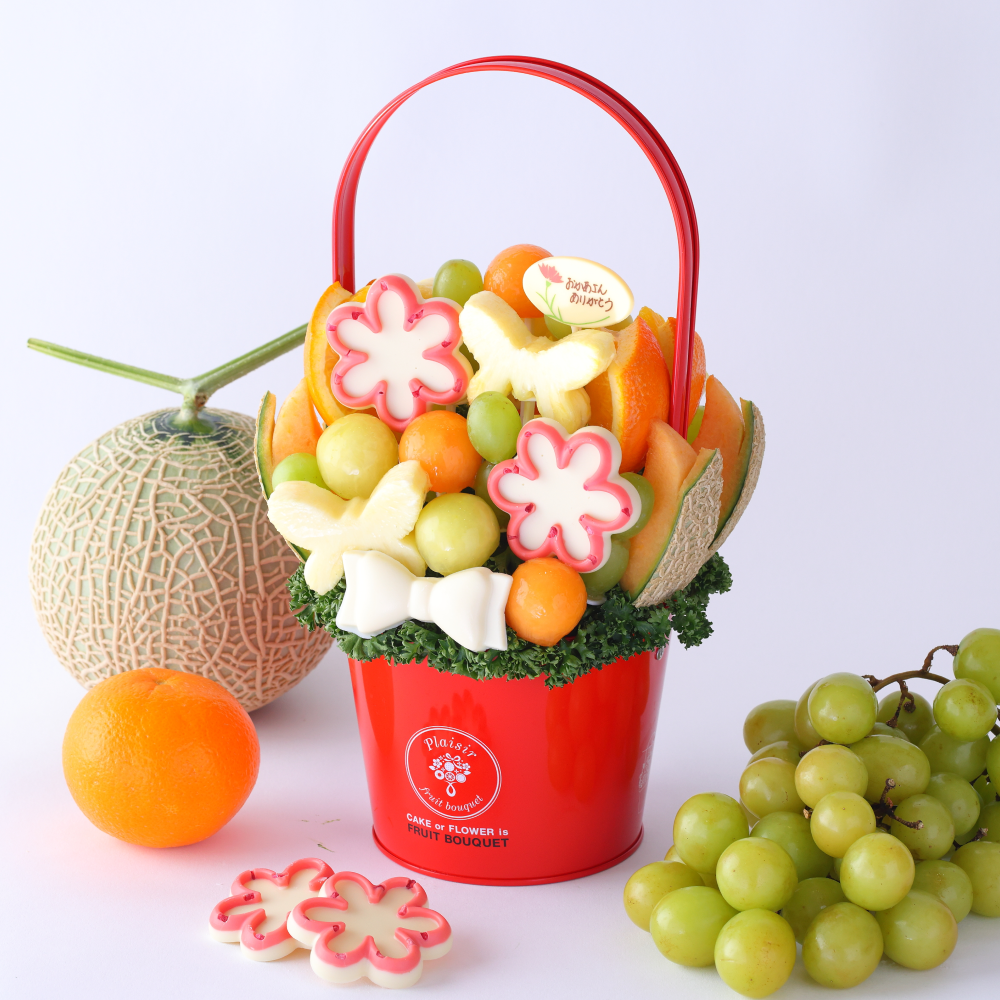 ピンクと白のチョコレートフラワー、2色のメロン、オレンジ、パイン、シャインマスカットなどを花束のようにアレンジし、フレッシュで華やかな印象に仕上げました。感謝と健康への願いを込めて贈る、プレジールならではの特別なギフトです。