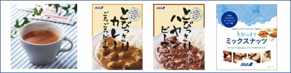 ANAオリジナル ビーフコンソメスープの味わいを活かしたANAフーズオリジナル商品が「ANAオリジナル ビーフコンソメスープシリーズ」です。同シリーズの『ANAオリジナル ビーフコンソメスープを使った とびっきりカレーごろごろビーフ』は販売開始以来、16年目となるベストセラー商品で、年間約16万個を販売しています。2022年に『とびっきりハヤシビーフ』、2023年には『とびっきりミックスナッツ』の販売を開始し、人気商品となっています。