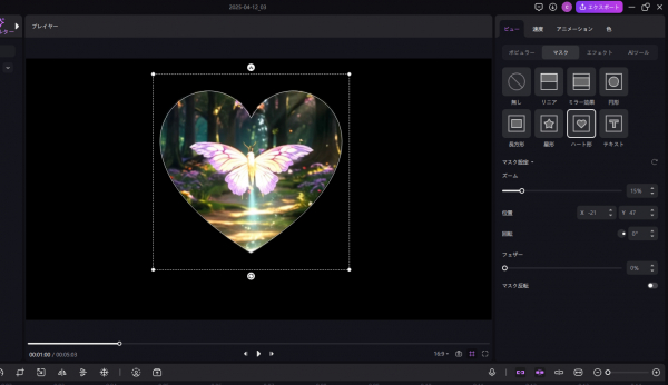 新たに追加されたマスク効果機能では、円形、長方形、ハート型、ミラー効果など、様々な形状のオーバーレイ効果が利用可能になりました。これらのエフェクトは重ねがけやアニメーション調整にも対応しており、より自由度の高い演出が可能になりました。