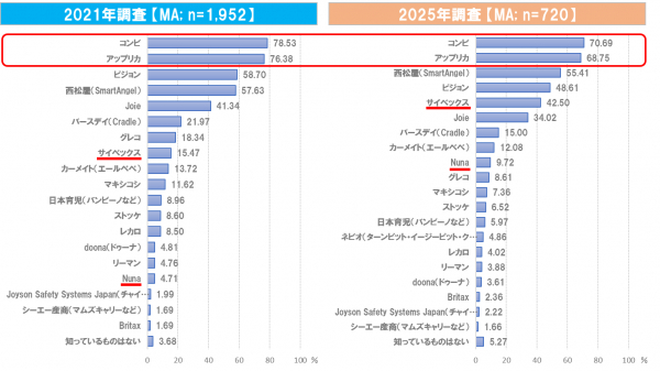 2025年調査において、認知度が高かったメーカーは「コンビ」(70.69%)および「アップリカ」(68.75%)であった(図3)。2021年との比較で特筆すべきは、「サイベックス」や「Nuna」といった海外ブランドの認知度が大きく上昇している点である。特に「サイベックス」は2021年の15.47%から2025年には42.50%へと大幅に上昇し、「Nuna」も4.71%から9.72%へと拡大しており、日本市場における海外ブランドの存在感が増している。