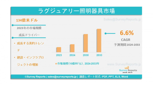 Survey Reports LLCは、2025年4月に「高級照明器具市場の製品タイプ別(シャンデリア、ペンダントライト)セグメント化、素材別(クリスタル、金属)セグメント化、デザインスタイル別(モダン、クラシック)セグメント化、エンドユーザー別(住宅、商業)セグメント化、価格帯別(プレミアム、ミッドレンジ)セグメント化」に関する調査レポートを発行したと発表した。- 2024年から2033年までの世界市場分析、動向、機会、予測を提供するレポート。高級照明器具市場の予測評価を提供する。このレポートでは、高級照明器具市場の成長促進要因、市場機会、課題、脅威など、いくつかの重要な市場力学に焦点を当てている。
