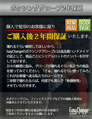 EasyChangeのヘッドギアには高品質ハンドメイドの証として商品ごとにシリアルロットのナンバーを印字しております。日々の練習に励み、ヘッドギアが壊れるぐらい私たちの商品を使ってみてください。「さぁ、壊れるぐらい使ってみろ」 これがお客様へ送る私たちのエールです。 二年間で壊れたならば、何度でも喜んで「無償修理」させていただきます。
