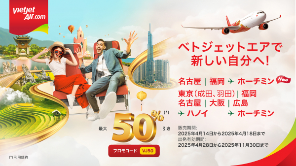 (東京, 2025年4月15日) - ベトジェットはベトナムの南部解放記念日を祝して、2025年4月18日までの間、今月就航される名古屋/福岡 - ホーチミン線を含む全路線のエコチケットが最大50%割引(*)になるチケットプロモーションを開催中です。ベトジェット公式サイト https://www.vietjetair.com またはベトジェットエアモバイルアプリでのご予約時、プロモーションコード「VJ50」を入力いただくと割引が適用されます。対象搭乗期間は2025年4月28日から11月30日まで(**)です。