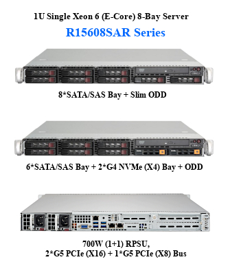 8台の12G SAS/SATAドライブが実装可能なR15608SAR-T2モデルと、6台の12G SAS/SATAドライブと4台のG4 PCIe NVMeドライブが実装可能なR15608SAR-T2N2モデルがラインナップされています。