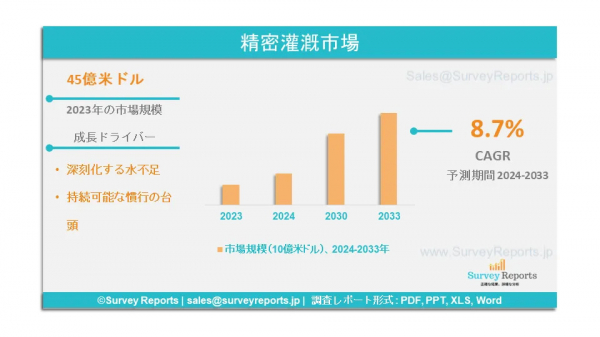 Survey Reports LLCは、2025年4月に精密灌漑市場に関する調査レポートを発行したと発表した。このレポートでは、精密灌漑市場の予測評価を提供しており、アプリケーション(畑作物、果樹園、温室、苗床)別、コンポーネント(灌漑用ハードウェア、センサー、制御システム、ソフトウェアソリューション)別、システムタイプ(ドリップ灌漑、スプリンクラー灌漑、表面灌漑、地下灌漑)別、技術(自動灌漑、遠隔監視、 土壌水分センサー) - グローバル市場分析、動向、機会、予測、2024年から2033年までの精密灌漑市場の予測評価を提供する。精密灌漑市場の成長促進要因、市場機会、課題、脅威など、いくつかの重要な市場力学に焦点を当てている。