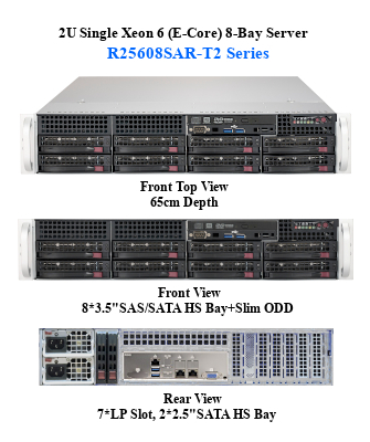 【2U ラックマウント RAIDサーバー, Intel Xeon 6 6700E CPU, Intel SoC PCH, 8*3.5” SAS/SATA 可脱着ベイ, 3*G5 PCIe/CXL2.0(X16)バス, 3*G5 PCIe/CXL2.0(X8)バス, 最大2TB DDR5 ECC 3DS-RDIMM / 512GB DDR5 ECC RDIMM, 2*10GbE LAN, 1200/1000W(1+1)冗長化電源】