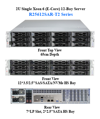 【2U ラックマウント RAIDサーバー, Intel Xeon 6 6700E CPU, Intel SoC PCH, 12*3.5” SAS/SATA可脱着ベイ, 3*G5 PCIe/CXL2.0(X16)バス, 3*G5 PCIe/CXL2.0(X8)バス, 最大2TB DDR5 ECC 3DS-RDIMM / 512GB DDR5 ECC RDIMM, 2*10GbE LAN, 920W(1+1)冗長化電源】