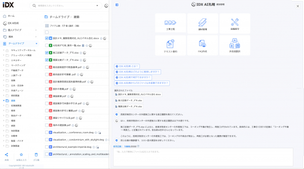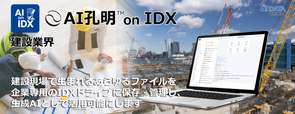 「AI孔明TM on IDX」は、設計書・図面(PDFや画像)、積算書、施工記録、是正報告、安全日報など、建設現場で生まれるあらゆるファイルを企業専用のIDXドライブに保存・管理し、RAG(Retrieval-Augmented Generation)型の生成AIとして活用可能にします。