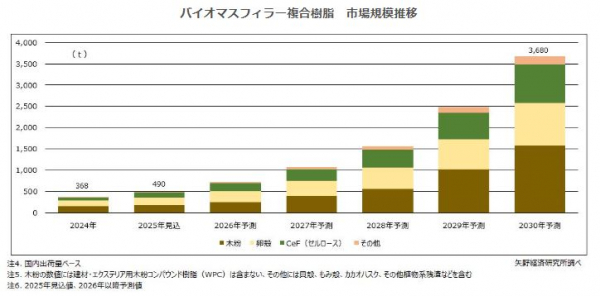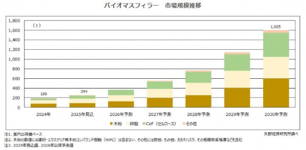 本調査では、バイオマスフィラーのアップサイクルでの動向を対象とした。アップサイクルされるバイオマスフィラーの国内市場規模は、2024年は複合樹脂ベースで368t、フィラーベースで189t、2025年見込みは複合樹脂ベースで490t(前年比133.2%)、フィラーベースで254t(同134.4%)と推計され、2030年には複合樹脂ベースで3,680t、フィラーベースで1,605tになると予測する。(いずれも建材向け木粉を除く)