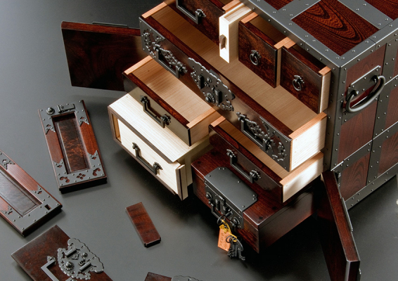 先代の勝木さんが船箪笥と出会ったのは昭和47(1972)年のこと。その精巧なからくりと頑強なつくり、そして独特の美しさに魅せられました。以来、製造技法の研究、試行錯誤を重ね、船箪笥の復元製作工程を確立していきました。素材から意匠、細部に至るまで当時の姿で復元しています。