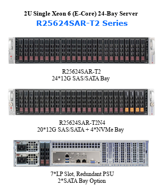 シングルスレッドコアのE-Core(Efficient-Cores)を使用した、LGA-4710 ソケット(ソケットE2)Xeon 6700E CPU 1基を搭載した奥行き63cmのEIA規格2Uシステムです。24基の2.5インチ SAS/SATA/NVMeホットスワップ対応ベイを装備し、クラウドサービスや動画コード変換、Eコマースなどマイクロサービス分野での高密度ワークロードに適しています。