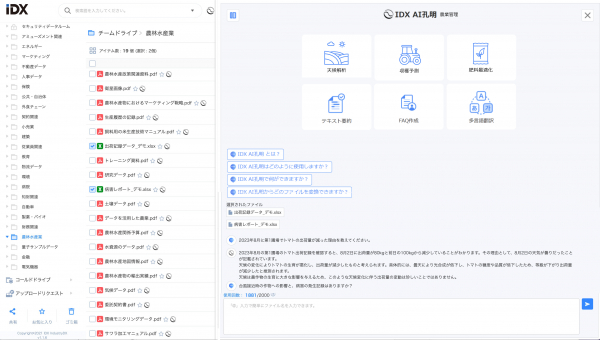出荷記録、施肥履歴、収穫日誌、写真レポート、品質評価などのファイルを農業者自身が、データ管理プラットフォームのIDX上に自社で保存し、自然言語でAIに質問したり、傾向を分析したりできる仕組みを提供します。