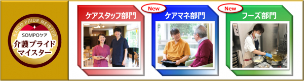 さらなる介護サービスの向上を目的として、このたび介護プライドマイスターにケアマネジャー部門とフーズ部門を新設しました。なお、ケアスタッフから選出される既存の介護プライドマイスターは、ケアスタッフ部門として引き続き選出します。