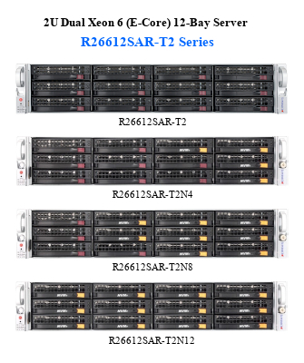 12台のSAS/SATAドライブが利用できるT2モデル、8台のSAS/SATAドライブと4台のNVMeドライブが利用できるT2N4モデル、4台のSAS/SATAドライブと8台のNVMeドライブが利用できるT2N4モデル、12台のNVMeドライブが利用できるT2N12モデルの4タイプが可能です。