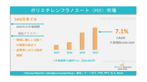 Survey Reports LLCは、2025年4月にポリエチレンフuran酸(PEF)市場に関する調査報告書を発表しました。この報告書は、グレード別(バイオベースグレード、ブレンド/カスタムグレード、食品グレード、高性能グレード、標準グレード、その他)、用途別(ボトル、繊維、フィルム)、最終用途産業別(自動車部品、電子・電気部品、繊維・テキスタイル、包装、医薬品、その他)の市場セグメンテーションを分析しています。- グローバル市場分析、動向、機会、および予測(2025-2035年)は、ポリエチレンフuran酸(PEF)市場の予測評価を提供しています。このレポートでは、ポリエチレンフuran酸(PEF)市場の成長要因、市場機会、課題、および脅威を含む、いくつかの主要な市場動向を強調しています。