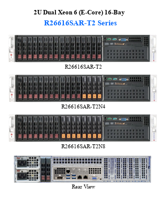 シングルスレッドコアのE-Core(Efficient-Cores)を使用した、LGA-4710 ソケット(ソケットE2)Xeon 6700E CPU 2基を搭載した奥行き65cmのEIA規格2Uシステムです。16基の2.5インチ SAS/SATA/NVMeホットスワップ対応ベイを装備し、クラウドサービスや動画コード変換、Eコマースなどマイクロサービス分野での高密度ワークロードに適しています。