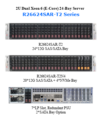 【2U ラックマウント RAIDサーバー, Dual Intel Xeon 6 6700E CPU, Intel SoC PCH, 20*2.5” SAS/SATA可脱着ベイ, 4*2.5” NVMe可脱着ベイ, Microsemi PM8044 12G SAS-Expander, 3*G5 PCIe/CXL2.0(X16)バス, 3*G5 PCIe/CXL2.0(X8)バス, 最大4TB DDR5 ECC 3DS-RDIMM / 2TB DDR5 ECC RDIMM, 2*10GbE LAN, 1200/1000W(1+1)冗長化電源】
