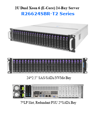 【2U ラックマウント RAIDサーバー, Dual Intel Xeon 6 6700E CPU, Intel SoC PCH, 16*2.5” SAS/SATA可脱着ベイ, 8*2.5” NVMe可脱着ベイ, 4*G5 PCIe/CXL2.0(X16)バス, 2*G5 PCIe/CXL2.0(X8)バス, 最大4TB DDR5 ECC 3DS-RDIMM / 2TB DDR5 ECC RDIMM, 2*10GbE LAN, 1200/1000W(1+1)冗長化電源】