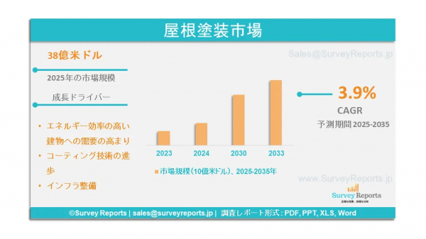 Survey Reports LLCは、2025年4月に「屋根コーティング市場セグメンテーション(基材別(アスファルト、金属、アスファルト、プラスチック、その他)、タイプ別(エラストマー、アスファルト、アクリル、シリコン、エポキシ、その他)、技術別(水系、溶剤系)、屋根タイプ別(平屋根、傾斜屋根) 用途別(住宅用、非住宅用)- グローバル市場分析、動向、機会、および予測(2025-2035年)」を発表しました。この報告書は、屋根コーティング市場の予測評価を提供し、市場動向の主要な要因、成長ドライバー、市場機会、課題、および脅威を強調しています。
