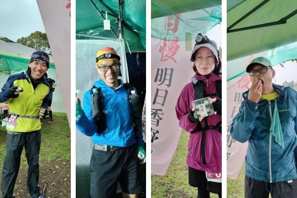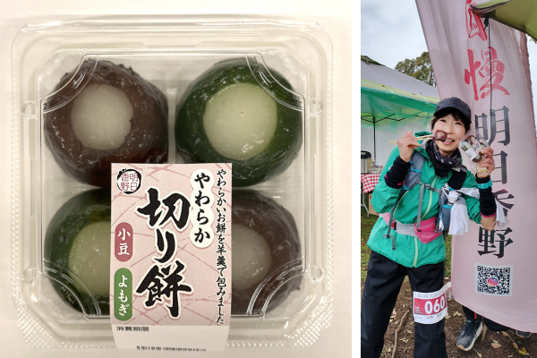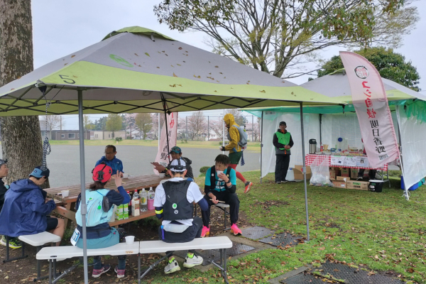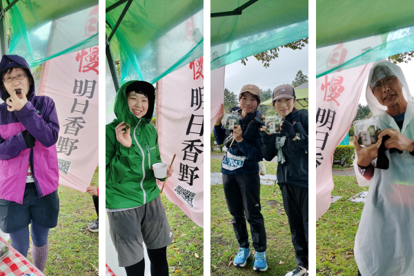 フル84名、ナイト51名の計145名が出場。初日は走りやすいコンディションでしたが、疲れの出てくる2日目には雨に見舞われる中、走り続ける展開でした。明日香野はゴールまで30km地点の第5エイドステーション「富士岡公園」で、ランナーの皆様に「やわらか切り餅(小豆・よもぎ)」を振る舞い、終盤を走るためのエネルギー補給をしていただきました。また、大会を一緒に盛り上げてくれたスタッフにも、それぞれお土産としてお渡しさせていただきました。