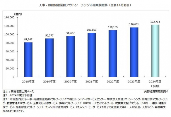 株式会社矢野経済研究所(代表取締役社長:水越孝)は、国内の人事・総務関連業務アウトソーシング市場を調査し、主要14分野サービスの動向、参入企業動向、将来展望を明らかにした。