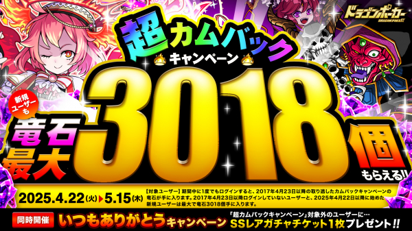 2017年4月23日以降に実施されたカムバックキャンペーンにて、ログインせずに受取れなかった竜石がまとめて手に入ります。2017年4月23日以降のカムバックキャンペーン期間中、ログインしていないユーザーに、最大で竜石3018個をプレゼント!さらに、2025年4月22日以降にドラゴンポーカーを始めたユーザーにも竜石3018個プレゼント!これを機会に、ドラゴンポーカーにログインして大量の竜石をGETしましょう!また、いつも『ドラゴンポーカー』をプレイして頂いているユーザーの皆様には「SSレアガチャチケット1枚」プレゼントいたします。