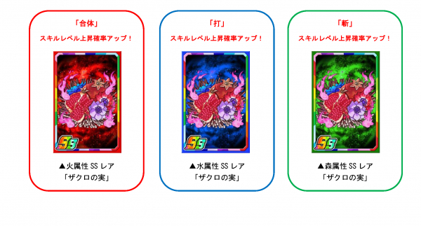 「略奪P」を使い素材ガチャを回すと、限定の強化素材「ザクロの実」を手に入れることができます。一部のモンスターに使うと強化値2倍の効果があるほか、合体・打・斬のスキルレベル上昇確率もアップします。