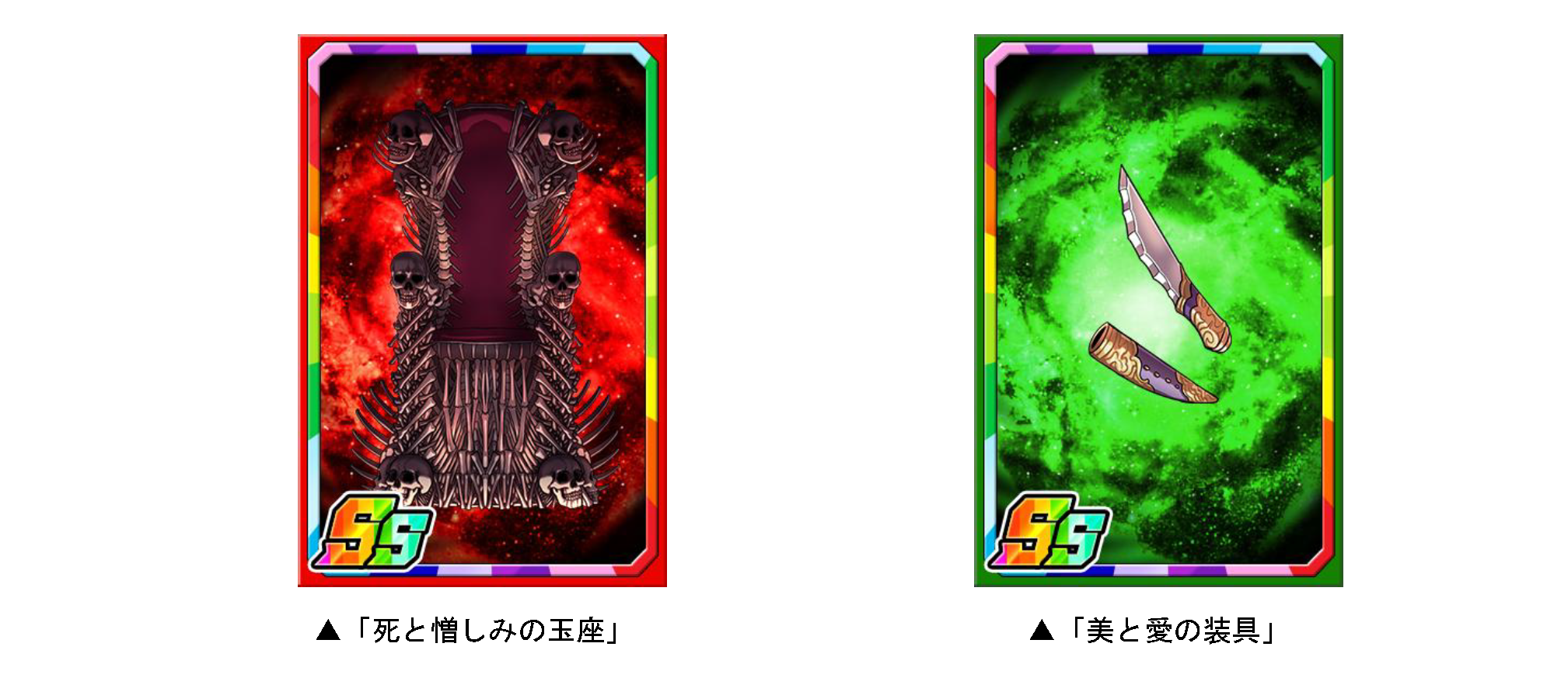 ダンジョンのボスモンスターを倒すと、まれに新たな限定子分カード「死と憎しみの玉座」「美と愛の装具」が手に入ります。限定子分カードは複数枚集めると進化ができ、子分スキルの効果が強力になります。