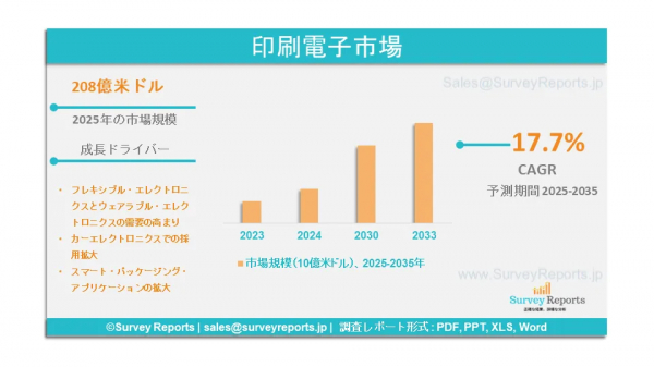 Survey Reports LLCは、2025年4月に「印刷電子市場セグメンテーション(材料別(インク、基材)、技術別(インクジェット、スクリーン、グラビア、フレキソグラフィ)、デバイス別(ディスプレイ、太陽光発電、照明、RFID、その他)、コンポーネント別(誘電体、接点材料、シリコン材料、プレゼンテーション、半導体)、用途別(生体認証、 セキュリティと軍事、医療、自動車)、用途別(自動車・輸送、医療、消費者向け電子機器、航空宇宙・防衛、建設・建築、小売・包装、その他の最終用途産業)- グローバル市場分析、動向、機会、予測、2025-2035」を発表しました。この報告書は、印刷電子市場の予測評価を提供し、成長要因、市場機会、課題、脅威など、印刷電子市場における主要な市場動向を強調しています。