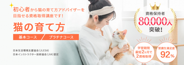 講座で学ぶ内容は日本生活環境支援協会の「猫の育て方アドバイザー」(https://www.nihonsupport.org/petshikaku/cat/)、日本インストラクター技術協会の「猫の健康管理インストラクター」(https://www.jpinstructor.org/shikaku/cat/)それぞれの資格試験対策になっています。