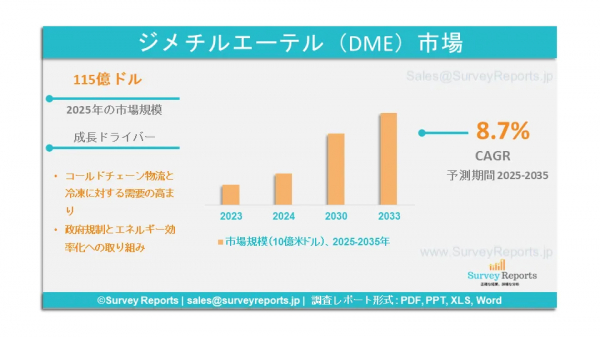 Survey Reports LLCは、2025年4月に「ジメチルエーテル(DME)市場セグメンテーション:原料別(天然ガス、石炭、その他)、用途別(LPGブレンド、エアロゾル推進剤、輸送用燃料、その他)」という調査報告書を発表しました。- グローバル市場分析、動向、機会、および予測(2025-2035年)というタイトルの報告書を発表しました。この報告書では、ジメチルエーテル(DME)市場の予測評価を提供しています。また、ジメチルエーテル(DME)市場における主要な市場動向、成長要因、市場機会、課題、および脅威を強調しています。