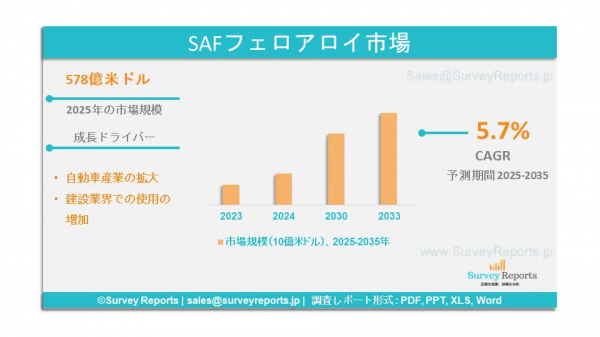 Survey Reports LLCは、2025年4月に「SAFフェロ合金市場セグメンテーション(タイプ別:フェロマンガン、フェロクロム、シリコマグネシウム、フェロニッケル、フェロシリコン、その他);用途別(炭素鋼・低合金鋼、ステンレス鋼、合金鋼、鋳鉄、その他)」に関する調査報告書を発表しました。- グローバル市場分析、動向、機会、および予測(2025-2035年)というタイトルの報告書を発表しました。この報告書では、SAFフェロ合金市場の予測評価を提供し、成長要因、市場機会、課題、および脅威を含む、SAFフェロ合金市場の主要な市場動向を強調しています。