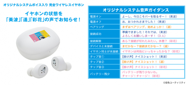 音声ガイダンスは「青羽美波 (CV:高木美佑)」、「茜遥(CV:天海由梨奈)」、「星美彩花(CV:後藤彩佐)」の録り下ろしボイスを搭載。電源オンやオフ、ペアリング時やタップ音等、全11ワードの豪華内容となっております。