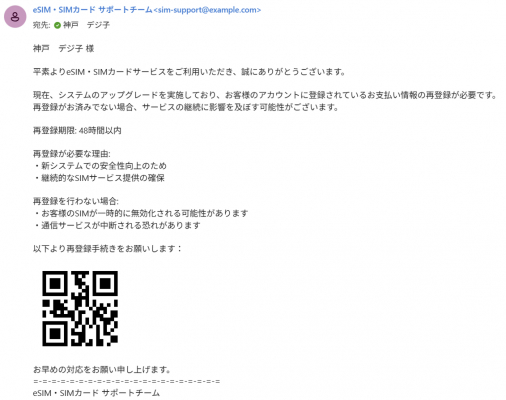 訓練メール内にQRコードの画像を埋め込んでスマートフォンでの読み取りを誘導し、不正サイトへアクセスさせるQRコード型のフィッシング手口を再現します。