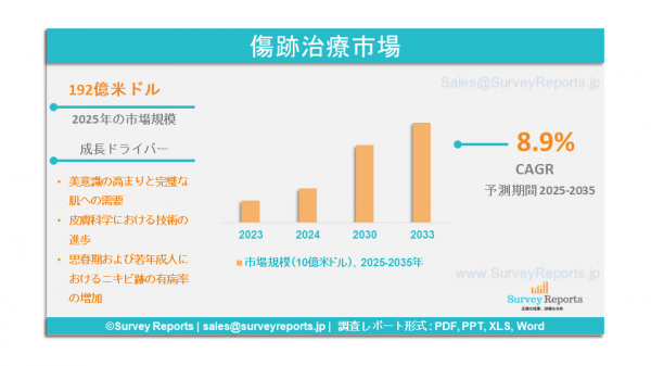 Survey Reports LLCは、2025年4月に「傷跡治療市場セグメンテーション」に関する調査報告書を発表しました。この報告書は、製品別(外用製品(クリーム、ジェル、シリコンシート、その他)、レーザー製品(CO2レーザー、パルスダイレーザー、その他)、注射剤、その他)、傷跡の種類別(萎縮性傷跡、肥厚性およびケロイド傷跡、収縮性傷跡、ストレッチマーク)、 用途別(病院、クリニック、在宅医療)- グローバル市場分析、動向、機会、および予測(2025-2035年)」を発表しました。この報告書は、傷跡治療市場の予測評価を提供し、成長要因、市場機会、課題、および脅威を含む複数の主要な市場動向を強調しています。