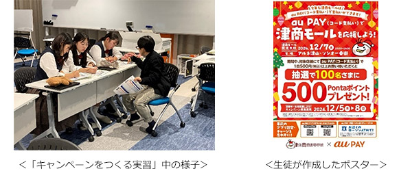 また、2024年12月に販売実習「津商モール」を実施した岡山県立津山商業高等学校(岡山県津山市、以下 津山商業高校)においては、生徒が商店街など地元のau PAY加盟店と連動したキャンペーンを企画する「キャンペーンをつくる実習」を行い、地域のキャッシュレス決済の活性化にもつながりました。