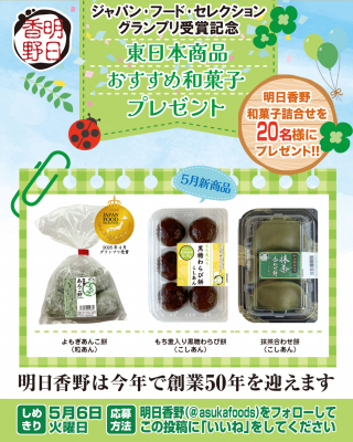 このたび、弊社が運営するSNS(明日香野【公式】X、明日香野【公式】Instagram)にて、季節の和菓子をプレゼントするキャンペーン「東日本商品おすすめ和菓子プレゼント」を開始しました。キャンペーンの開催期間は2025年4月21日から5月6日までとなります。