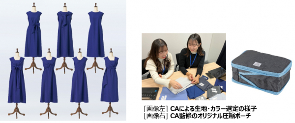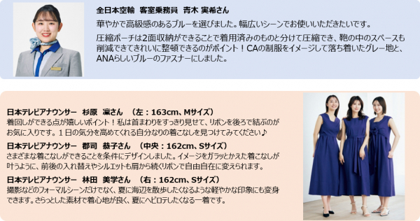 新商品の「ANA meets Audire 7days wrap dress(Blue)」はANA限定カラーとして上品で落ち着いたブルーを採用し、着こなしの幅を拡げる仕様にこだわりました。前後を入れ替えたり、リボンの結び方を変えることで、何通りもの着こなしをお楽しみいただけます。肩にかかる布の両端を体に巻きつけるように結ぶと、気になるお腹周りや肩回りをおしゃれにカモフラージュしてくれます。下着が響きにくい生地を採用し、夏場でも1枚で安心して着用できます。シワになりにくく、自宅や旅先での洗濯も可能。ビジネスからデイリーユース、トラベルまで、この1枚で手軽に“自分仕様”の着こなしを叶えられる一着に仕上がりました。さらに今回の企画のために、本ワンピースやカーディガンなどが収納できる出張や小旅行に重宝する「CA監修オリジナル圧縮ポーチ」を作り、セットにしました。カラーはCAの制服をイメージしたグレーとブルーの配色です。