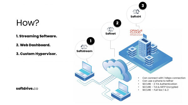 本サービスに実装されているSoftdriveは、「Softvirt」、「Softnet」、「Softstream」の3つのコンポーネントで構成されており、クラウドベースで最適化された仮想デスクトップ環境を実現します。
