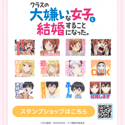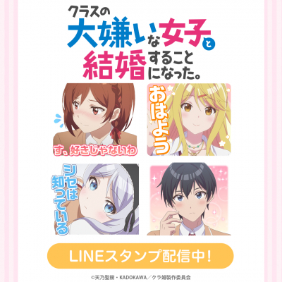 TVアニメ『クラスの大嫌いな女子と結婚することになった。』初となるLINEスタンプがインクルーズより配信開始!是非、LINEスタンプでもTVアニメ『クラスの大嫌いな女子と結婚することになった。』の世界観をお楽しみください。