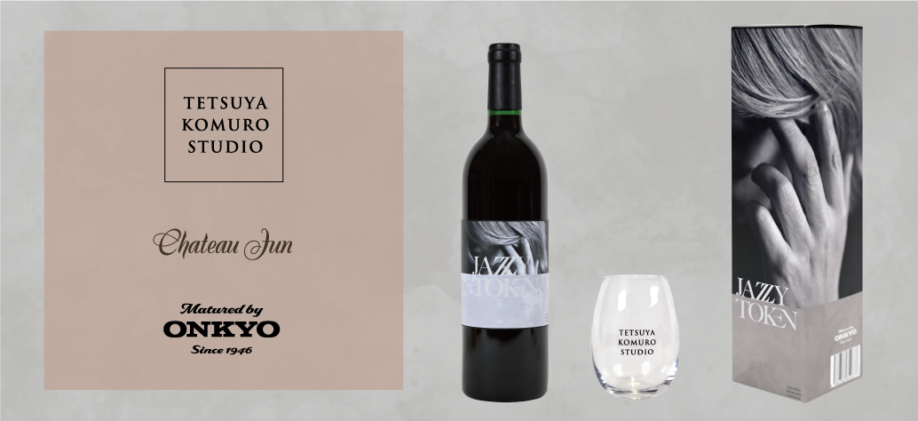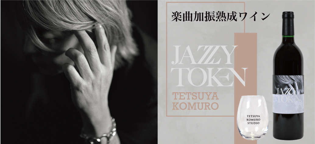 今回のワインの葡萄種には、「山ソーヴィニヨン」を使用。『JAZZY TOKEN』をワイン樽に取り付けた加振器により、熟成期間に音の振動で加振する機材を直接樽に取り付け、醸造期間の発酵中に響かせる製造過程となります。商品の仕様としてまずは表裏のラベルには『JAZZY TOKEN』のジャケットに合わせたトーンのデザインを採用しており、個装箱は高級感のあるマット仕上げの紙質となっております。特典としては「TETSUYA KOMURO STUDIO」のロゴをシンプルにデザインしたオリジナルワイングラスが付属しています。