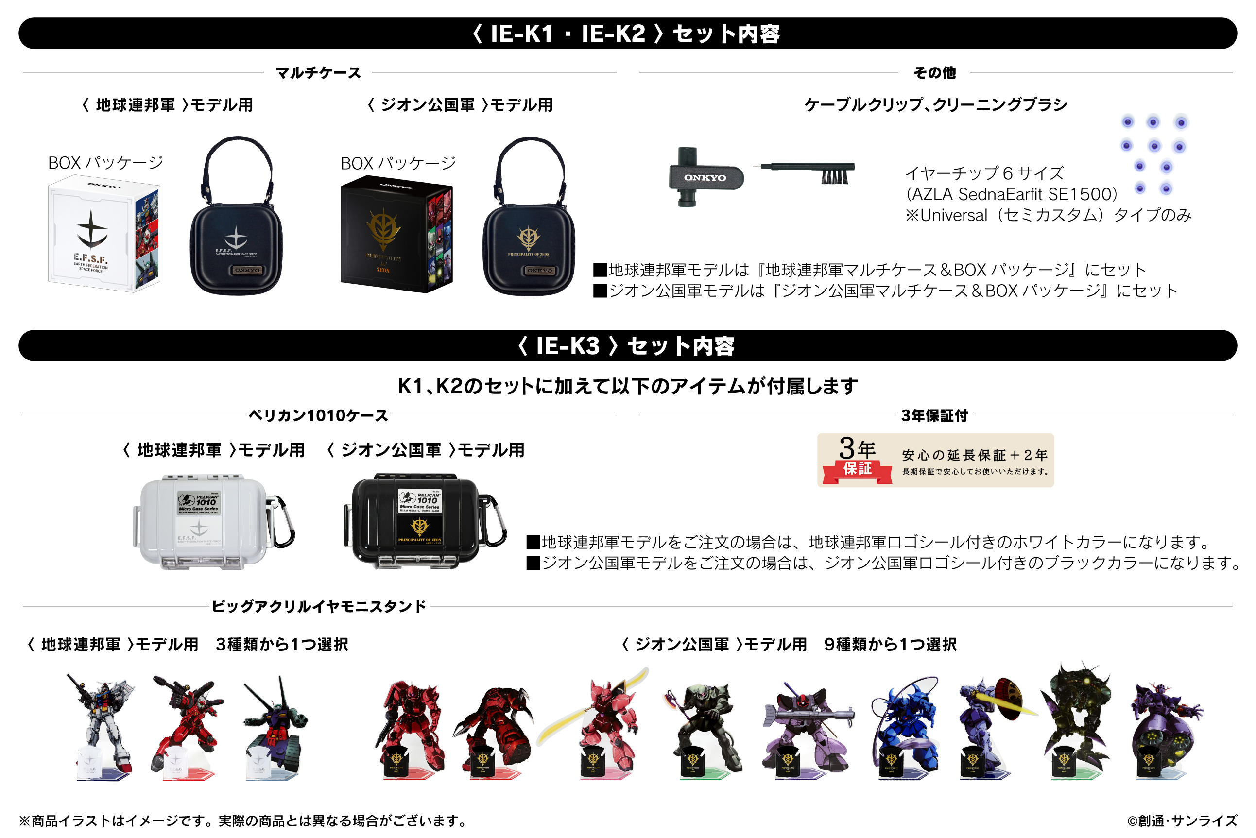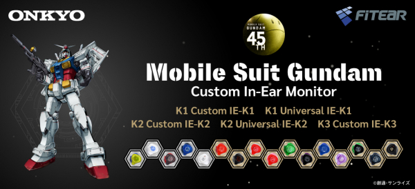 オンキヨー株式会社(所在地:大阪府大阪市、代表取締役社長:大朏 宗徳)は、株式会社須山歯研(所在地:千葉県千葉市、代表取締役社長:須山 慶太)と共同開発したマグネシウム振動板バランスドアーマチュア型ドライバー搭載カスタムインイヤーモニター「K1 Custom&Universal IE-K1(以下IE-K1)」と、今回から導入する新機種「K2 Custom&Universal IE-K2(以下IE-K2」※1、「K3 Custom IE-K3(以下IE-K3」※2との、『機動戦士ガンダム』※345周年記念コラボレーションモデルを販売致します。