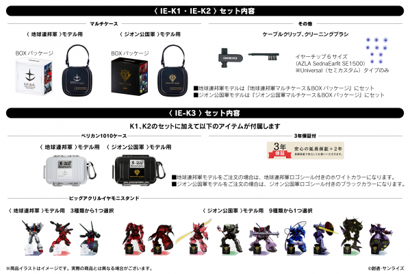 本コラボレーションモデルは、地球連邦軍「ガンダム(2タイプ)」「ガンキャノン」「ガンタンク」、ジオン公国軍「シャア専用ザク(2タイプ)」「シャア専用ズゴック」「シャア専用ゲルググ」「ザクII」「ドム」「グフ」「ギャン」「ビグ・ザム」「ジオング」の全14モデルをラインナップ。地球連邦軍、ジオン公国軍共に右側は統一、左側は選択式(地球連邦軍は4種、ジオン公国軍は10種)となります。ケーブルはFitEar cable 004(IE-K1用)、FitEar cable 012(IE-K2&IE-K3用)、ケーブルクリップ、クリーニングブラシを付属。Universal(セミカスタム)モデルのイヤーチップはAZLA SednaEarfit SE1500(SS,S、MS,M,ML,Lの6サイズ)。地球連邦軍モデルは地球連邦軍マルチケース&BOXパッケージにセット、ジオン公国軍モデルはジオン公国軍マルチケース&BOXパッケージにセットとなります。また、ビッグアクリルイヤモニスタンド(全12種)を販売、K3 Custom IE-K3モデルには、「3年保証付」「ペリカン1010ケース」「ビッグアクリルイヤモニスタンド」を付属致します。尚、「春のヘッドフォン祭2025」に須山歯研と共同で展示・試聴、耳型採取が可能なブースを出展致します。