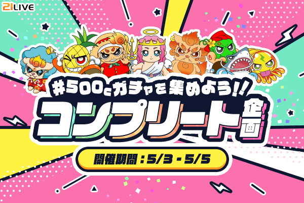株式会社エムアンドティーティー(本社:沖縄県北谷町、代表取締役:井藤 三知子)が運営するエンターテイメント・ライブ配信アプリ【21LIVE(ニーイチライブ)】URL: https://21.live では、5月3日(土)より『500Cガチャを集めよう!!コンプリート企画』を開催いたします。