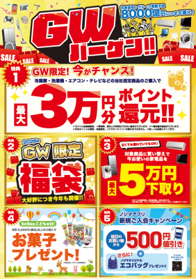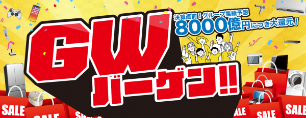 株式会社ノジマ(神奈川県横浜市、代表執行役社長・野島廣司)は、4月26日(土)より、ゴールデンウィークバーゲンを実施いたします。グループ業績予想が過去最高の8,000億円につき、決算直前のゴールデンウィークにおいて、お客様に日頃の感謝の気持ちを込めて大還元いたします。ぜひお近くのノジマへお越しください!