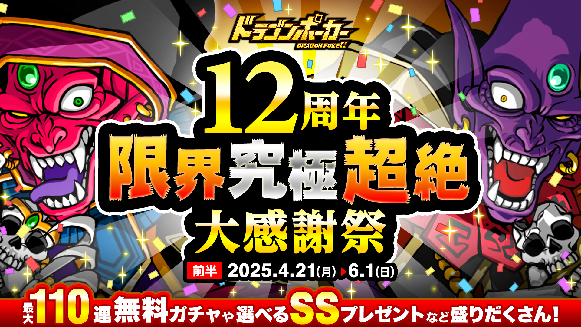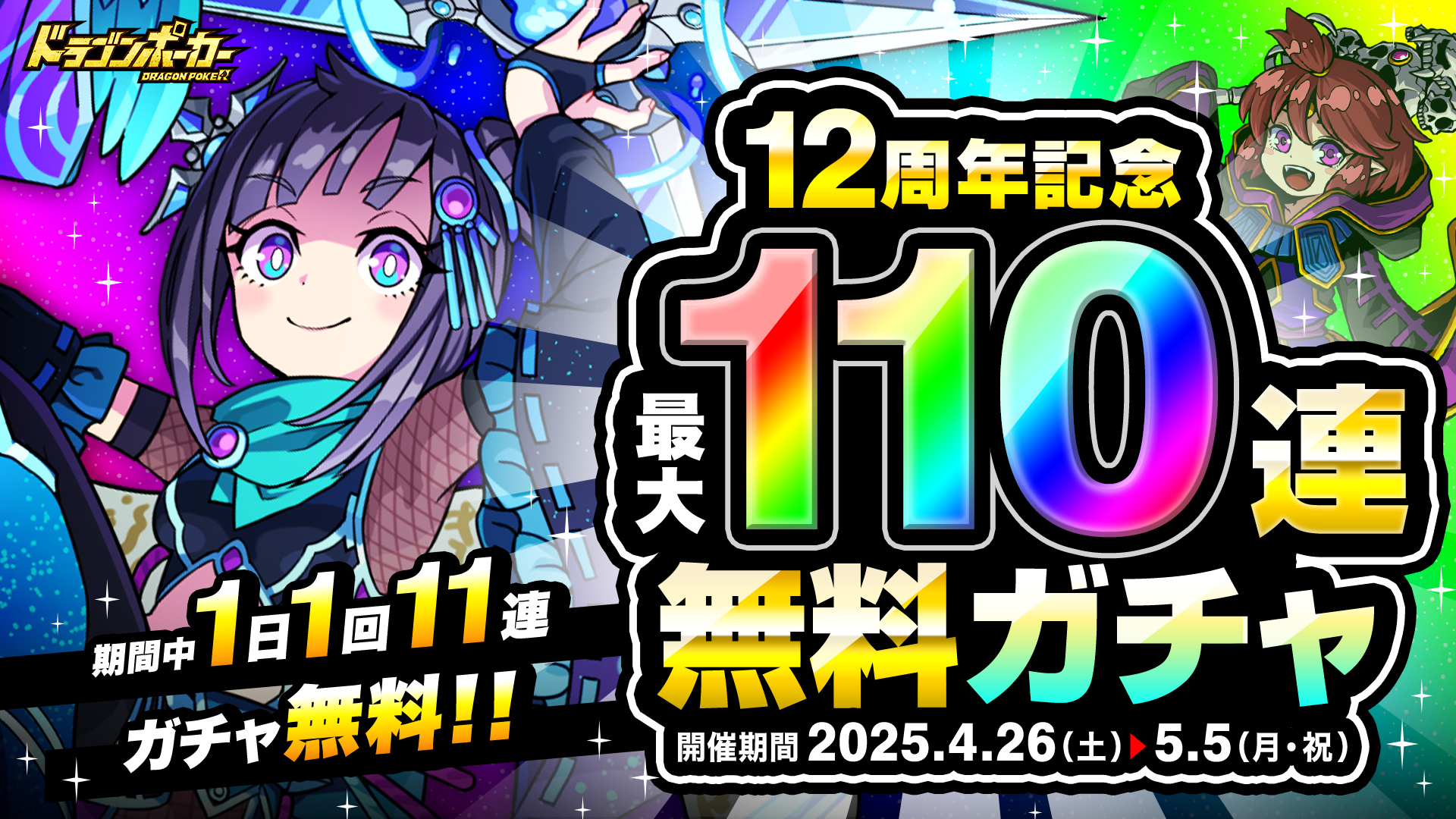 おかげさまで、リアルタイム合体カードバトル『ドラゴンポーカー』は、2025年5月17日(土)にサービス開始12周年を迎えます。これを記念し「12周年記念最大110連無料ガチャ」を開催いたします。また、期間中にログインするだけで竜石やSSレアガチャチケットなど様々なアイテムがもらえる「12周年記念ログインキャンペーンpart1」なども開催中!この機会にぜひ『ドラゴンポーカー』をお楽しみください!