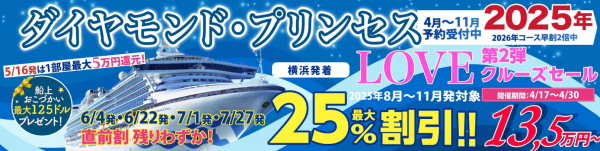 対象コース、対象キャビンが売り切れ次第終了となるセールです。上記以外でも、6/4発、6/22発、7/1発、7/27発のダイヤモンド・プリンセス横浜発着クルーズの直前割(フラッシュセール)をおこなっております。この機会にダイヤモンド・プリンセス日本発着クルーズでの優雅な船旅をお得にご予約ください!
