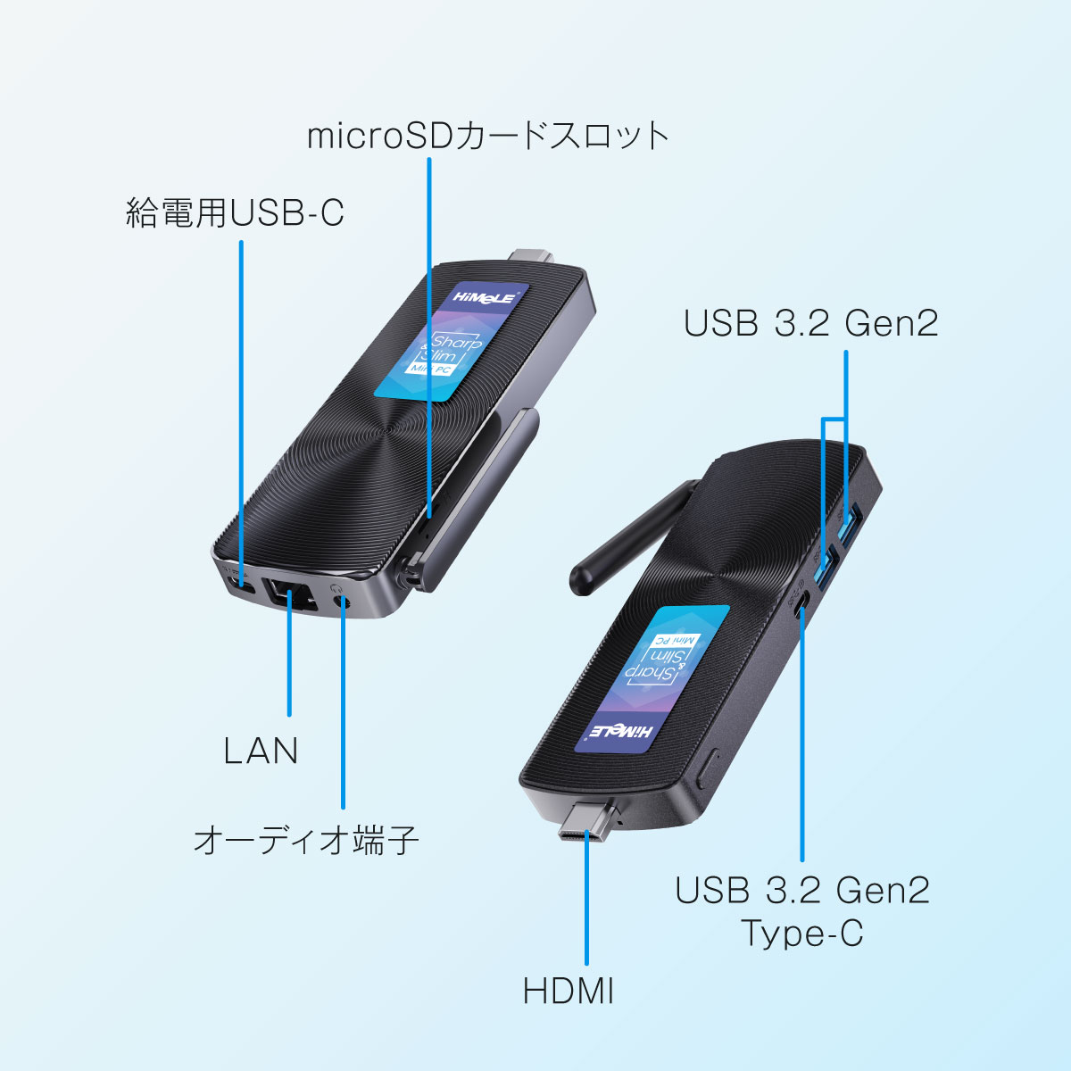 HiMeLE(ハイメレ) PCG02は、Intel(R) Processor N100を搭載したスマホサイズのスティック型ファンレスミニPCです。わずか16 mmの薄さでありながら4コア4スレッド、最大3.4 GHz動作のCPUを搭載しています。HDMIとUSB-C端子を搭載し、リモートワークや出張先での使用などPC本体を持ち運んでの運用も可能です。