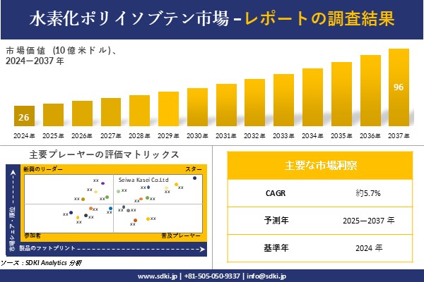 SDKI Analytics(本社:東京都渋谷区)は、このたび、2025年04月17に「水素化ポリイソブテン市場調査レポート:2025-2037年の市場規模、シェア、傾向の予測」を発表しました。水素化ポリイソブテンに関する市場調査レポートには、統計的および分析的アプローチを使用した予測評価が含まれています。この調査レポートでは、一次および二次調査方法を使用して分析された主要な業界洞察を通じて将来の傾向を理解できるようにすることで、主要な市場動向を読者に説明しています。