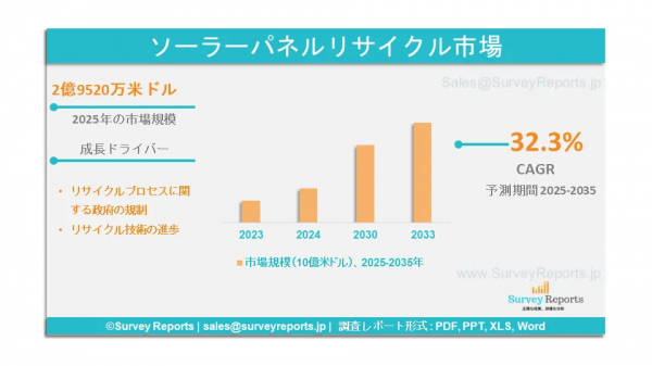 Survey Reports LLCは、2025年4月に「太陽電池パネルリサイクル市場セグメンテーション:タイプ別(単結晶、多結晶、薄膜)、プロセス別(熱、化学、機械、レーザー、組み合わせ)、保存期間別(早期劣化、通常劣化)、材料別(金属、ガラス、プラスチック、シリコン)」に関する調査報告書を発行したことを発表した。- グローバル市場分析、動向、機会、および予測(2025-2035年)を発行しました。この報告書は、太陽光パネルリサイクル市場の予測評価を提供し、成長要因、市場機会、課題、および脅威を含む、太陽光パネルリサイクル市場の主要な市場動向を強調しています。
